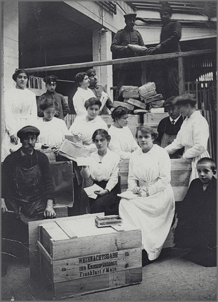 Frauen schickten Briefe und Pakete an Soldaten, die oft „Liebesgaben“ genannt wurden. Diese enthielten je nach Vermögen der Familie Trockenfrüchte, Lebensmittel, Bücher, Tabak, Seife, Wäsche oder Feuerzeuge.