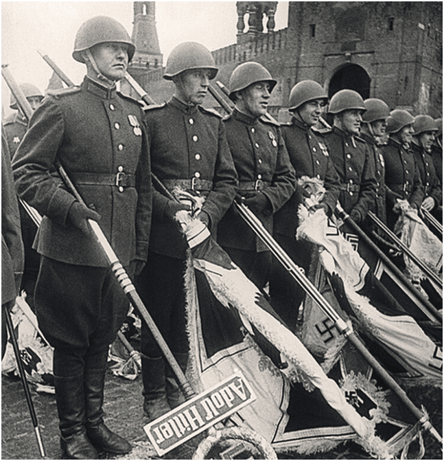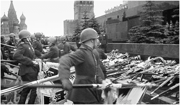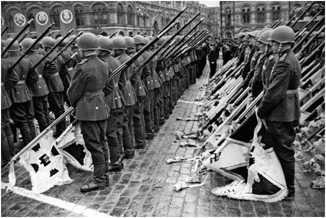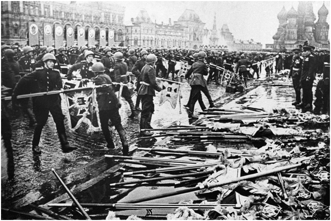 Німецький історик Маттіас Уль у 2016 році заявив “Die Welt”, що радянська армія публічно принизила військову честь вермахту, коли його прапори були кинуті на землю перед Мавзолеєм. Але це був не спонтанний жест: сценарій параду готувався з ретельністю театральної постановки. Сталін особисто наказав: гітлерівські знамена мають бути демонстративно кинуті до ніг переможців. Ідея мала глибоке історичне коріння, її запозичили у Суворова, який після перемог наказував зневажливо кидати трофейні прапори, щоб підкреслити поразку ворога, а не глумитися над ним особисто.